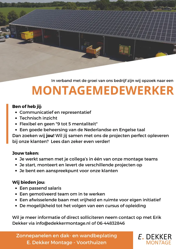 Meer weten of direct solliciteren? Stuur een mail naar info@edekkermontage.nl of bel met Erik Dekker op 06-44832846.
